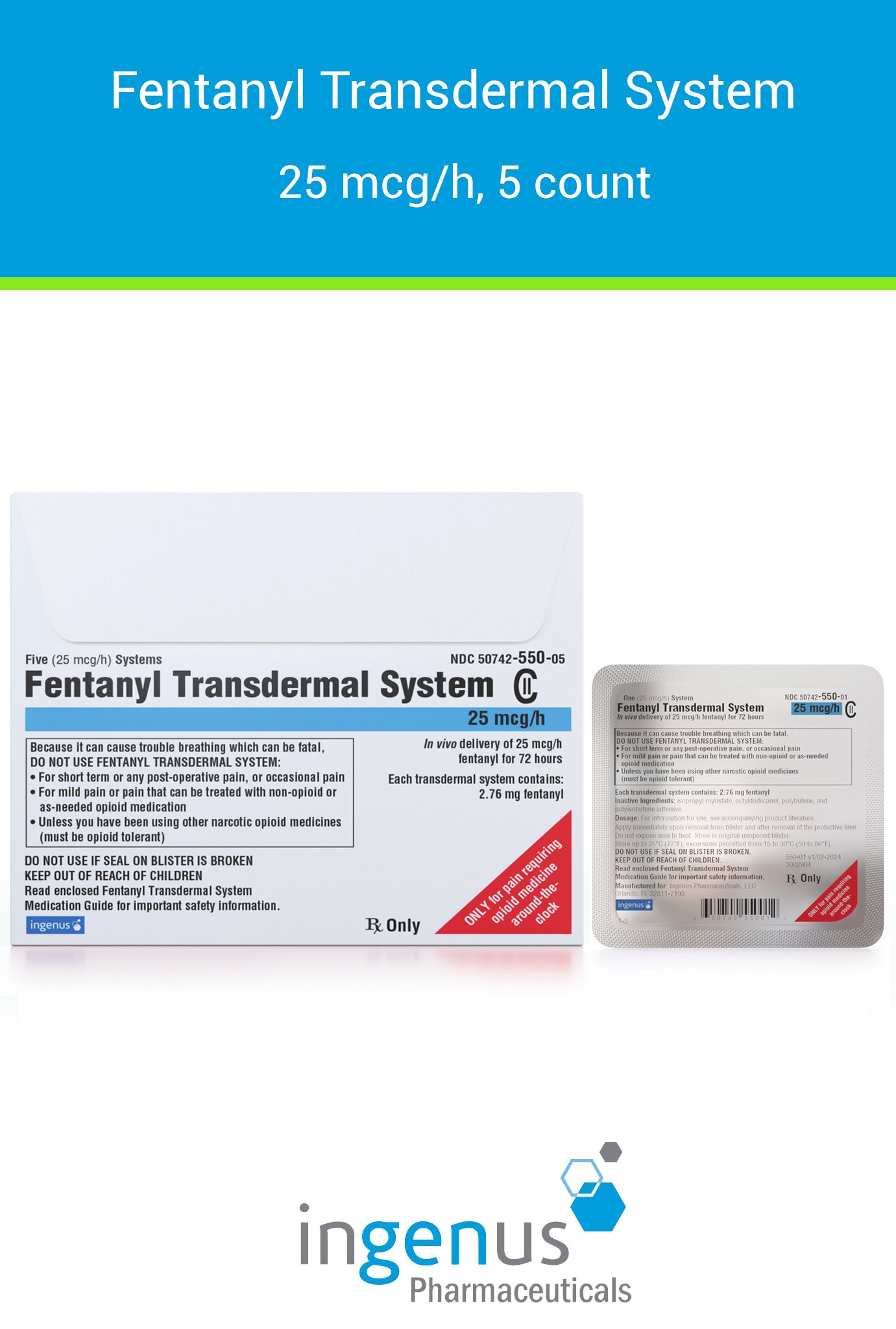 | Duragesic® | 50742-0550-05 | 25 mcg/hr | 5 | View | View |