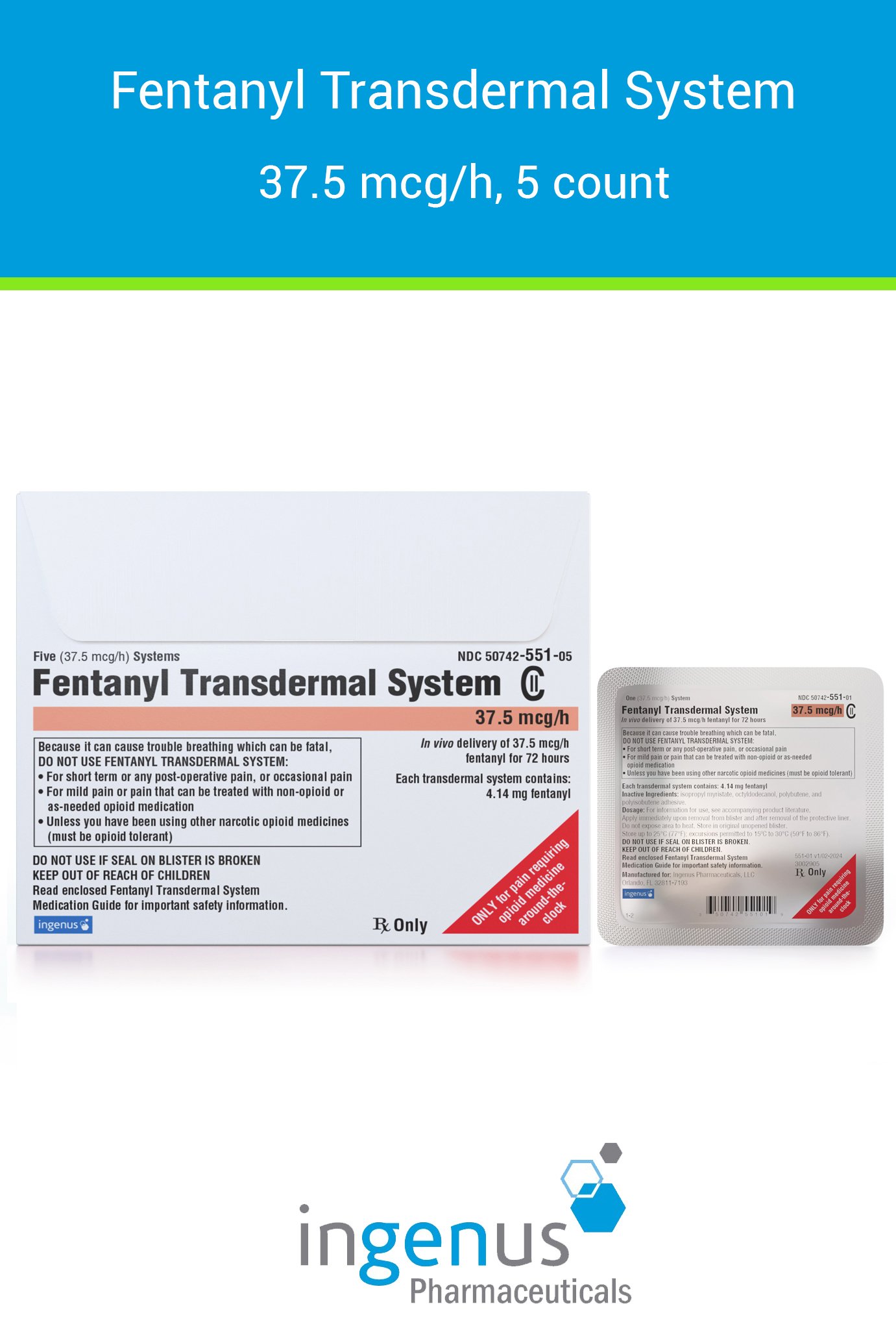 | Duragesic® | 50742-0551-05 | 37.5 mcg/hr | 5 | View | View |