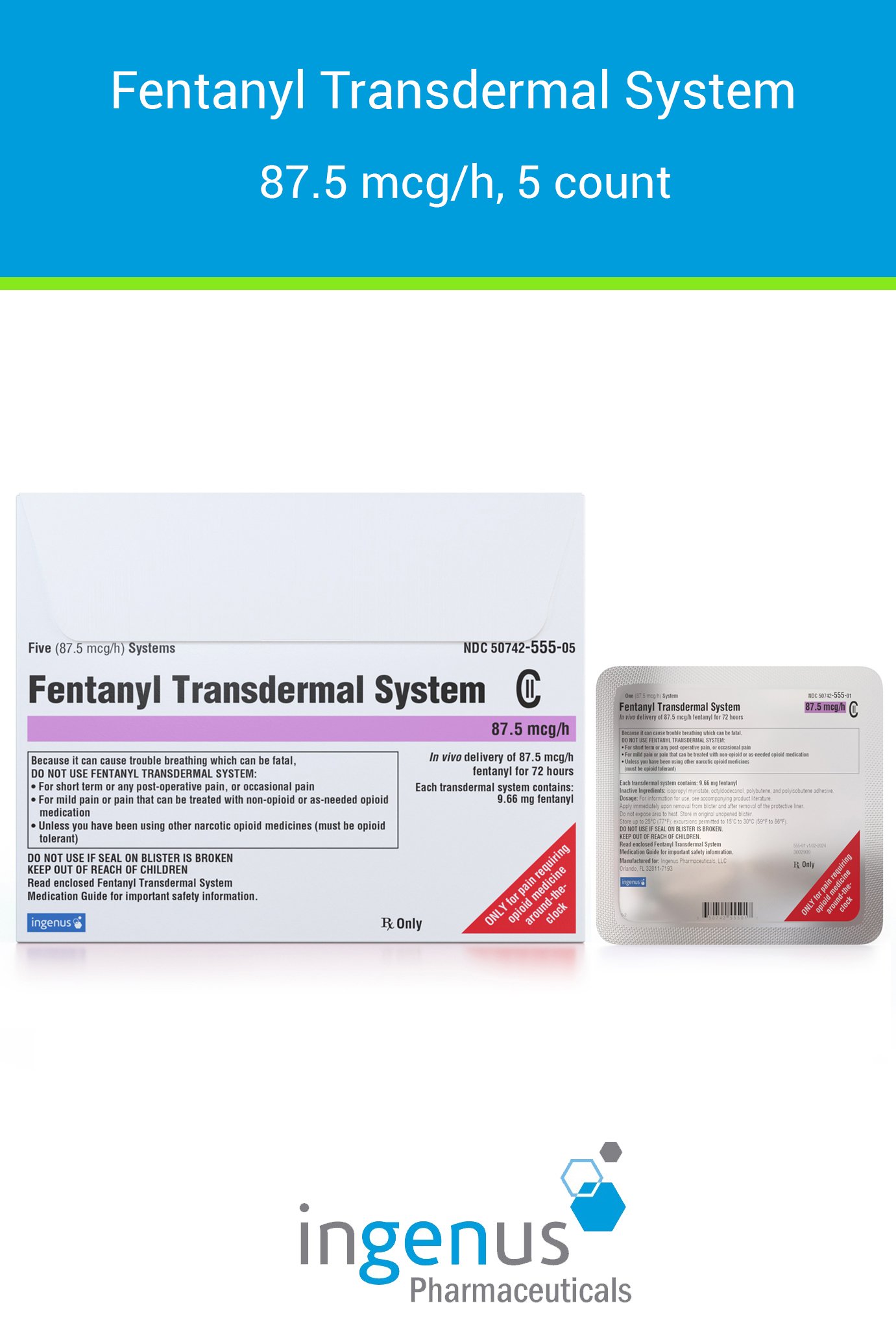 | Duragesic® | 50742-0555-05 | 87.5 mcg/hr | 5 | View | View |